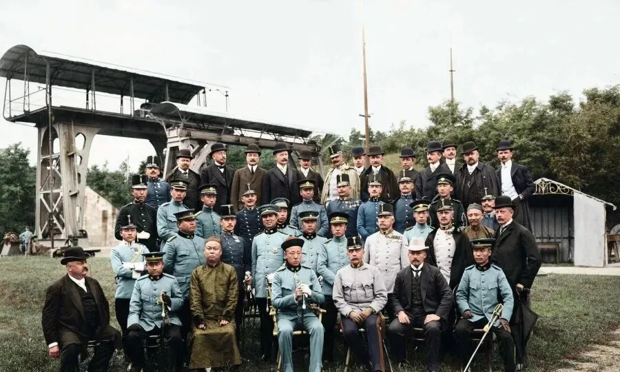 这群穿蓝灰制服的叫使团,前排坐着的是领队和贵人,胸前绶带一条条,帽檐压得低,后排洋人站成半弧,留着八字胡,场地像是练兵台,边上有铁制的架子,冷不丁看还以为游乐园的滑道呢。