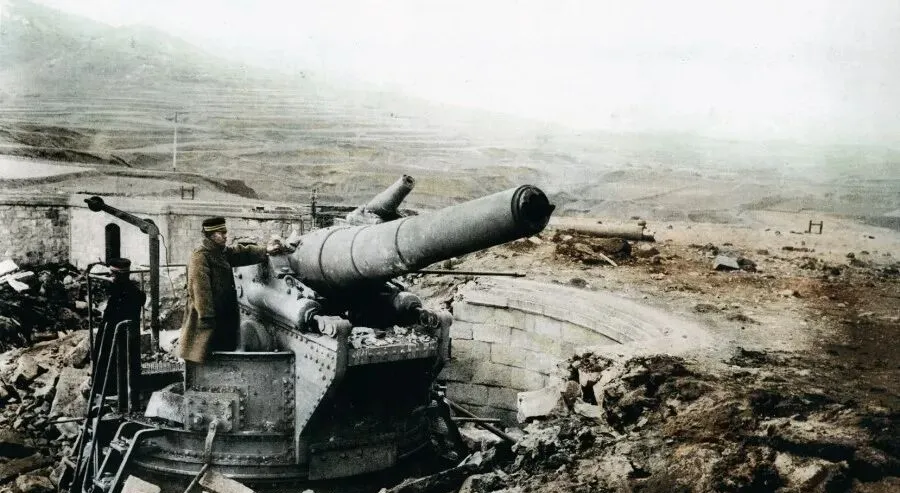 这个庞然大物叫岸炮,铁甲底座钉得密密麻麻,炮管粗得要两个人合抱,山风一吹,旗子抖得直响,站在炮旁的军官把手扶在炮耳上,像在估摸角度,背后是层层黄土台地,冷清得很。