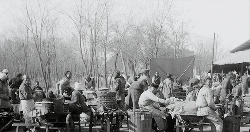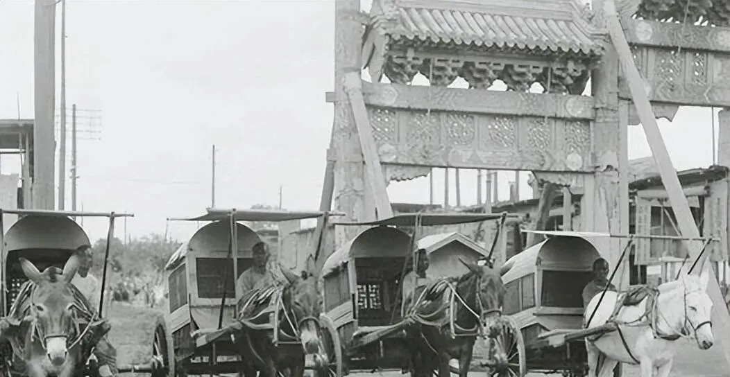 图中一排小屋似的车叫骡马车,篷子半月形,车窗小小的,车夫攥缰不抬头,鞭子一抖,车轮嘎吱两声就走,母亲说那时候晚了回家,得攒着铜子儿上这玩意儿,冷风从车缝里钻,可比步行省劲儿。