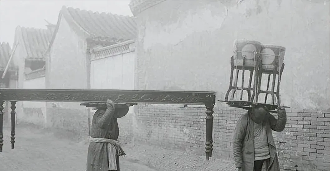 这两位脑袋顶着的长家伙叫条案和鼓凳,案面边上一圈回纹,腿子溜直溜直的,搬运工腰间一根麻绳勒得死紧,父亲看见这张相片直说,这体面木料,现在得上博物馆见了。