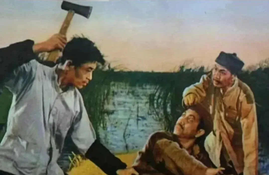 画面左边高举斧头的是主角,右边揪着人的,是翟春华的硬角儿,腮帮子鼓着,肩膀抬得高,他抓人的手指发白,真用了力气,不是摆造型,这种“带劲”的动作,现在拍戏很少见,怕摔着怕扯着,那时候条件苦,戏里有汗味。