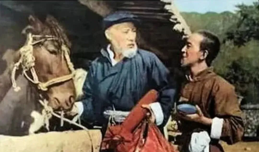 这张彩色里站在马旁的是翟春华演的小厮,捧着海碗,脖颈细长,嘴上甜,脚下却悄悄往主人影子里挪,怕挨训也想着捞好处,奶奶笑他,这人两头瞧,我说,正因为像,才好看。