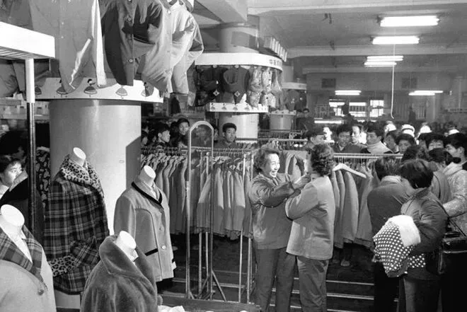 1980s,春节期间的上海南京路,到处是顾客盈门,显得格外繁荣。图为上海最大的百货公司——第一百货商店里,顾客在挑选新年的新衣服。当年一年到头,人们难得买件新衣。杨溥涛 摄