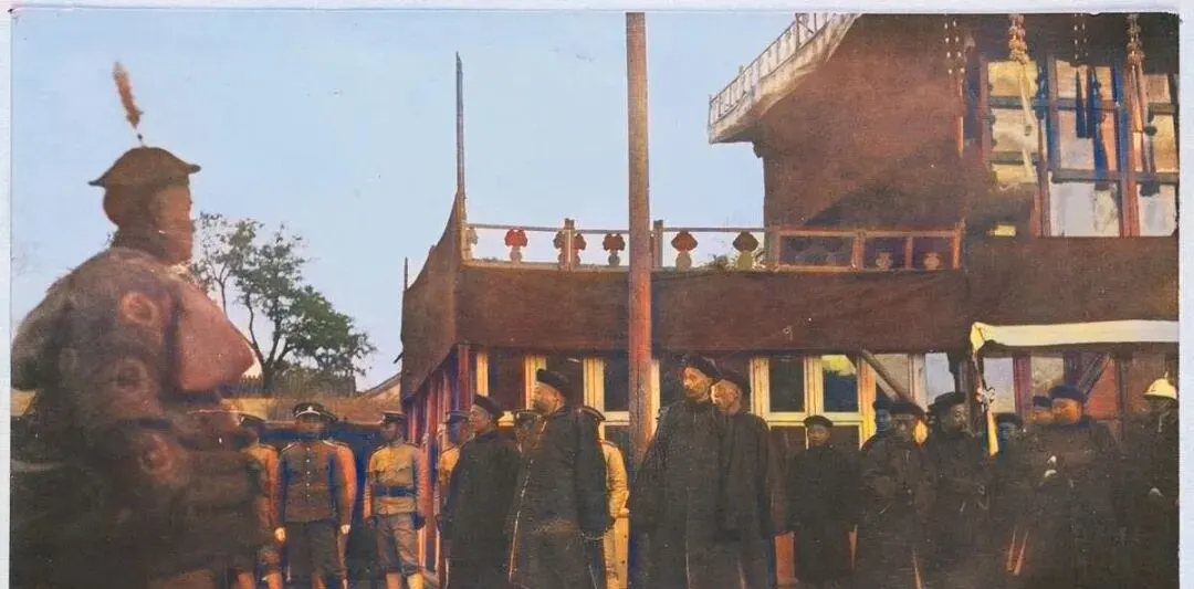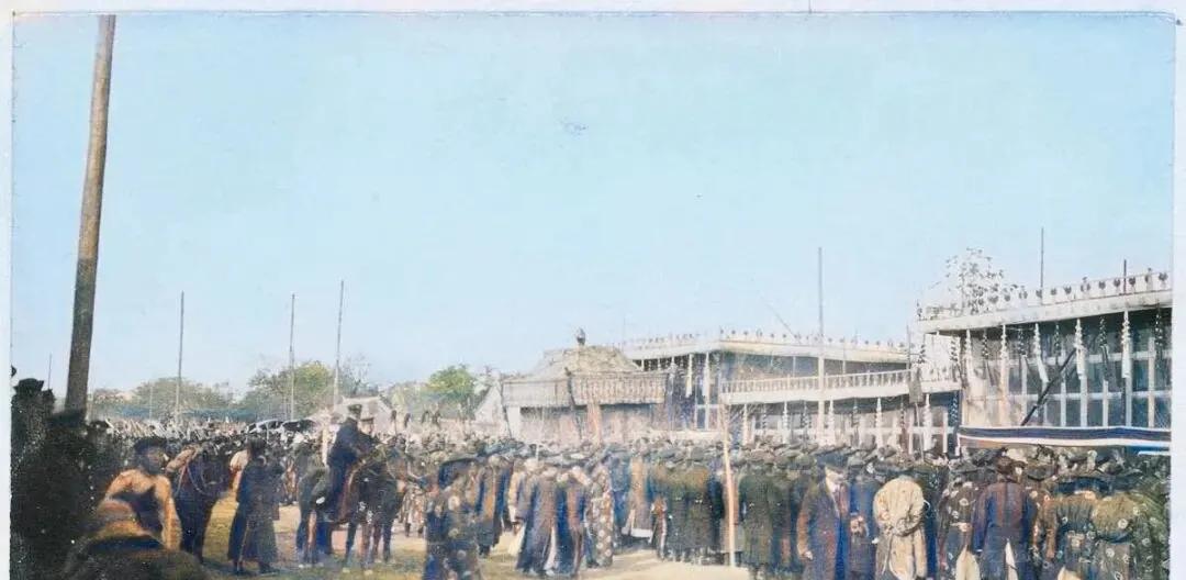 图中这一排穿新式军装的叫侍卫队,呢料军服呈土黄色,胸前带扣一字排开,帽檐压得低低的,旁边黑呢长袍的老绅与胡子花白的差役并肩站着,脸上都紧着神色,楼檐下挂着长穗的绛纱幔子,被风吹起一线波纹,妈妈看了说,这阵仗一看就不是平常祭礼,规矩全起了,外人只能远远看着,不敢出声。