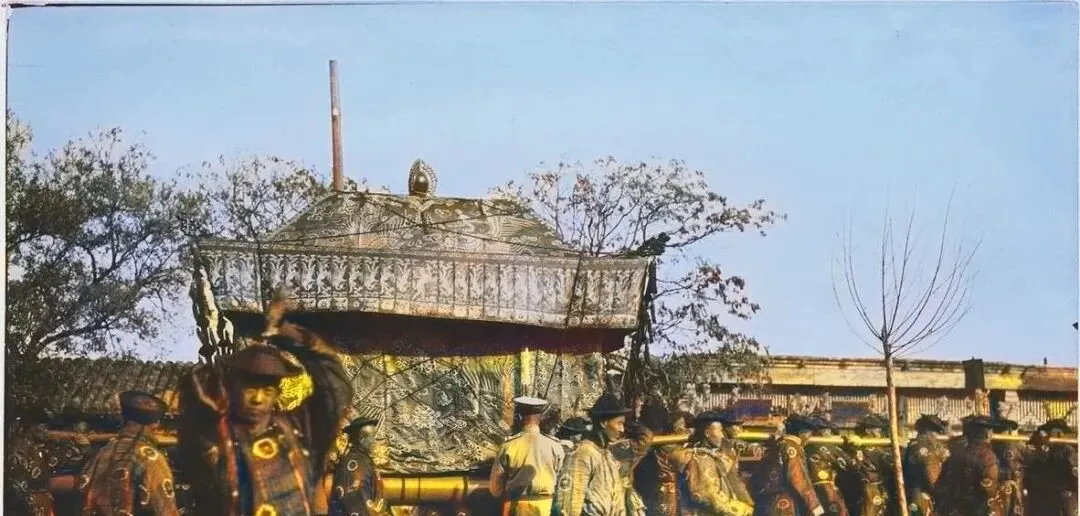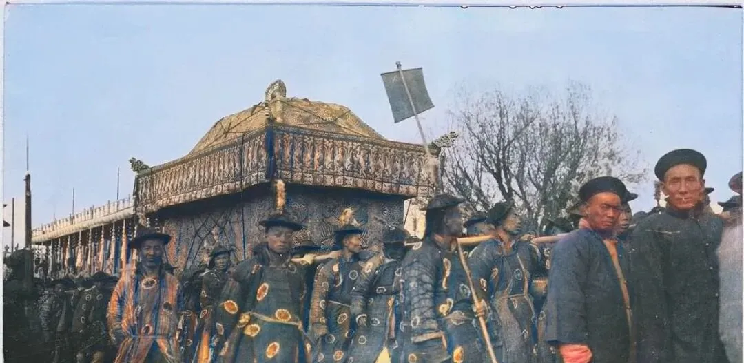 图中这口巨大的叫大灵轿,顶呈八棱隆起,四角压着金色兽首,轿身绣缠枝莲与回字纹,细看能见到密密的盘金线,抬杠粗得像一条小臂,穿蟒补的执事排成一线,肩窝卡住杠,手指紧扣,脚下步子齐得很,口号从队头往后传,咚咚两声锣,队伍就缓缓起落,像一条长河挪动。