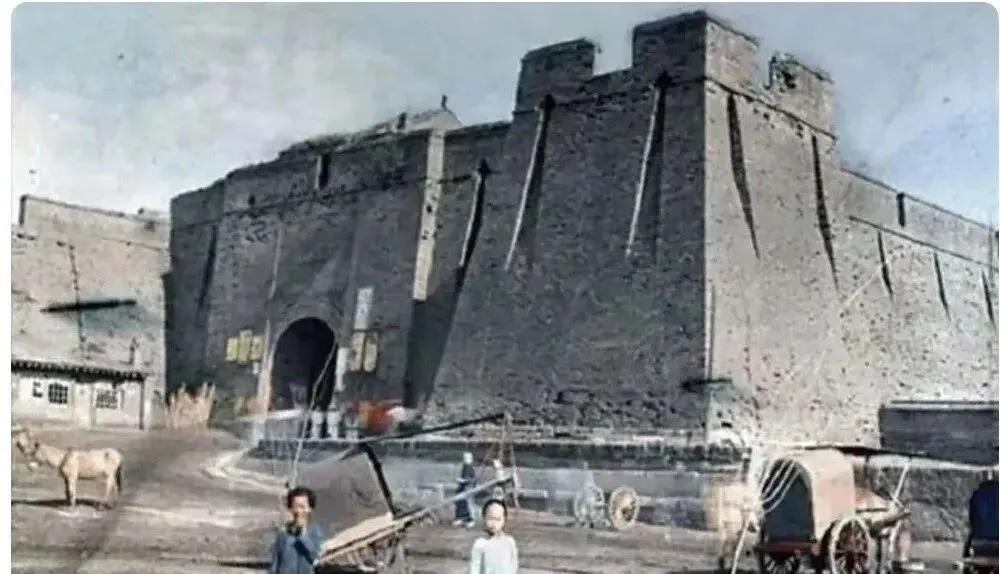 图中这段厚重的城砖墙叫老城门,黑灰的墙体像一头蹲着的石兽,拱形门洞上还挂着斑驳门钉,城根旁立着木轮车和毛驴,地上车辙一圈一圈,像年轮一样把来往人事都压进土里了,奶奶看见这张图笑说当年赶集就是这么个光景,一碗热面一口老酱,天再冷也不觉。