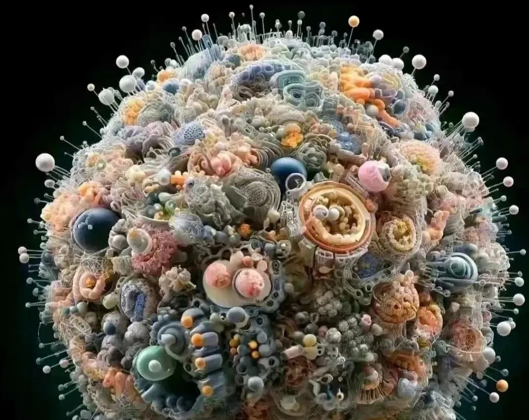 这团五彩细密的圆球指的是细胞的内部世界,像一座迷你城,层层叠叠的膜和管道往外探着触须,珠子似的颗粒一串串挂着,乍看热闹,其实各有分工,妈妈看过之后乐了,说别小瞧这一点点,身体里每时每刻都在演出一台大戏呢。