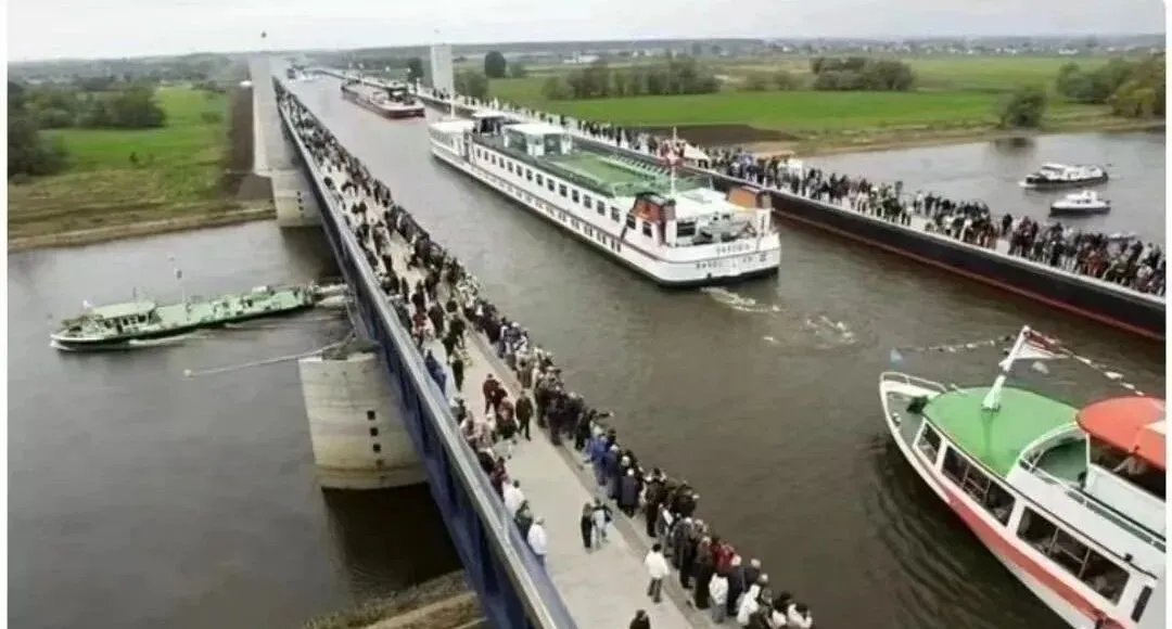 这个长条条的是水桥,桥身里不是路而是水,船在桥上走,人就在桥边走,像两条并排的河,一条给船一条给人,最妙的是风顺水静,白船慢慢挪,孩子倚着栏杆看水里涟漪发呆,那时候哪想得到,桥还能这么修。