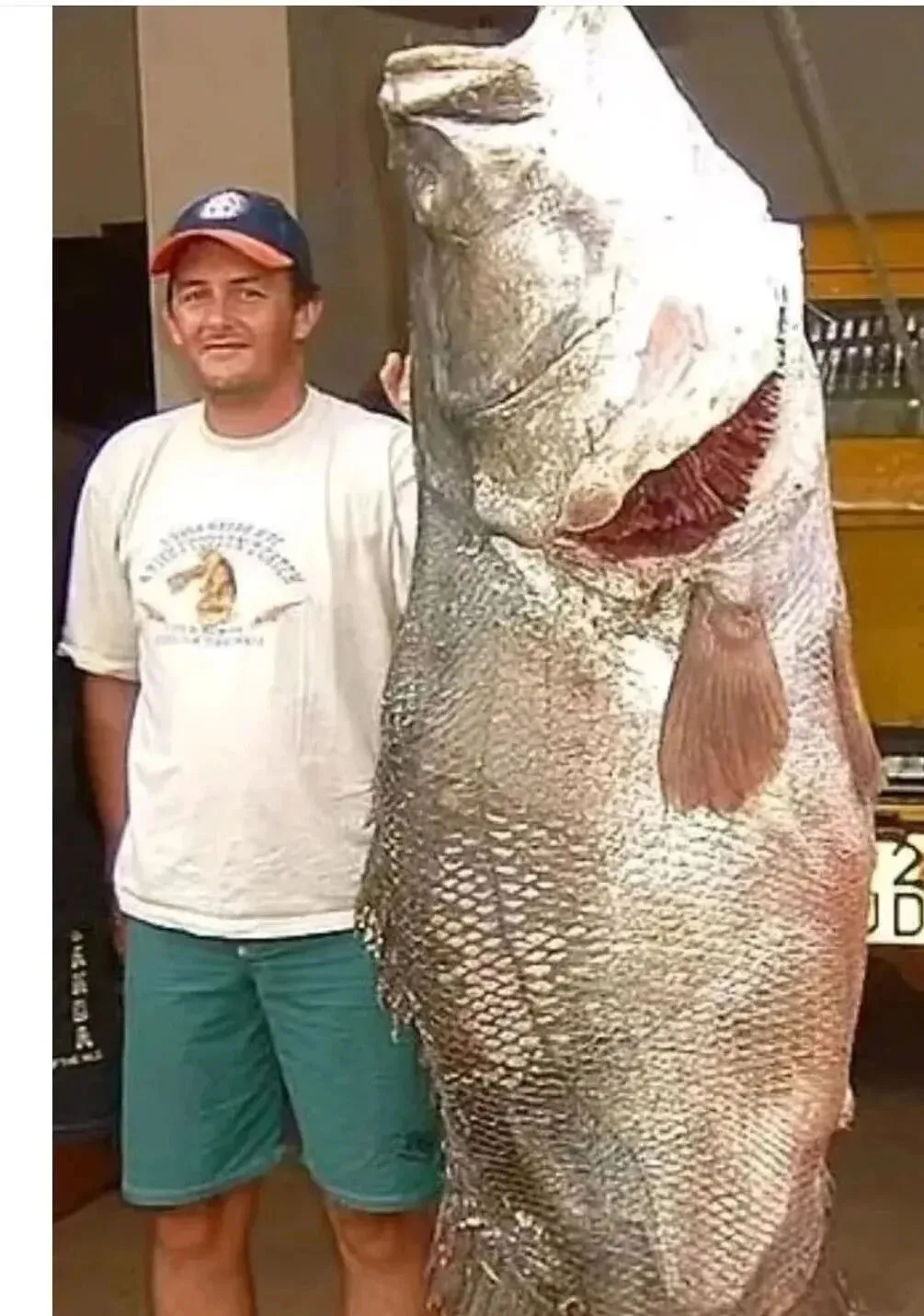 图中这条银亮的大鱼叫大鲈,身子有成人那么高,鳞片一片片像盾牌,嘴边的须子往外探,小伙子站在旁边只到它肩,老渔民说这家伙胃口大,河里小鱼小虾都不够它塞牙缝,过去逮着了得靠几个人合力拉,现在讲究保护,见着了多拍两张照就放回去更合适。