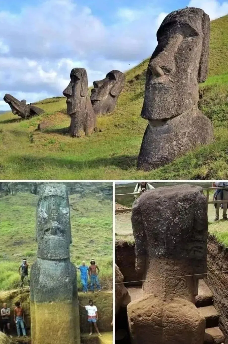 图里的这些大脑袋叫石像,露在地上的只是脸和脖,真正身躯还埋在土里,鼻梁高高的,嘴抿着像谁欠它一口饭,石身上刻着浅浅纹理,天一阴就像要开口说话,我们小时候看画报只见脑袋,现在翻到考古的照片,才知道身子也不小,谁刻的谁搬的,至今还是个问号。