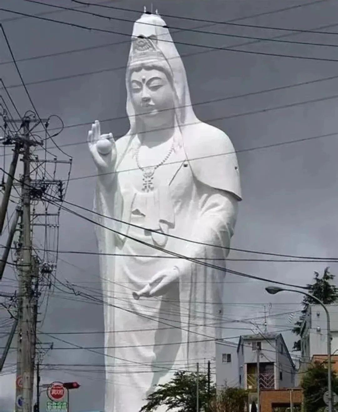 这个通体雪白的身影是大佛像,高到把电线剪成一缕一缕的前景,指尖捏着一颗圆珠,肩披长衣,眉目沉静,云来了靠在她的肩,风过了从她的袖里绕出去,城市里车来车往,她像个守夜人站在那儿,给人心里按下一颗定心丸。