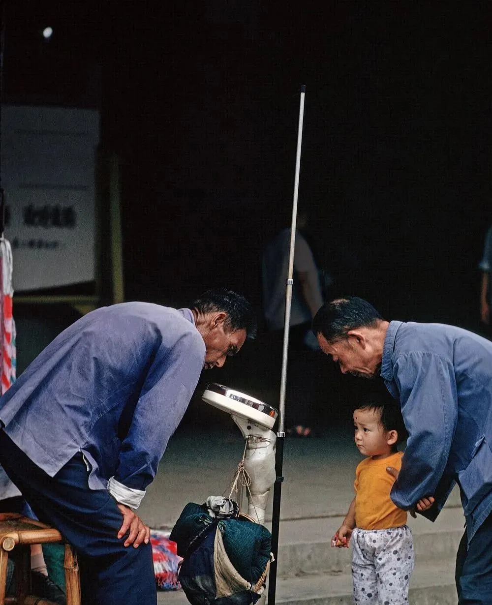 图中这杆白壳子的是台秤,圆脑袋是秤盘,秤杆细长直立,下面挂着布包做砝码,摊主弯腰凑着刻度看数儿,小孩被大人护着站在一旁瞪着大眼,像在等一块多两块的零头,妈妈那时常说别着急,称足了再给糖。