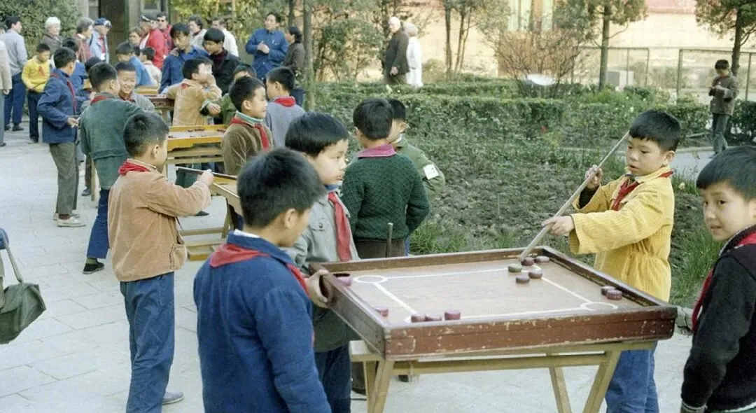 这方桌子是木台球,四周木框,球是漆木圆饼,细杆推着走,打得啪嗒脆响,少先队员围一圈排队等,输的人把球从框里一颗颗抠出来,袖口上都是白粉,那会儿下课十分钟,能打出世界冠军的气势。