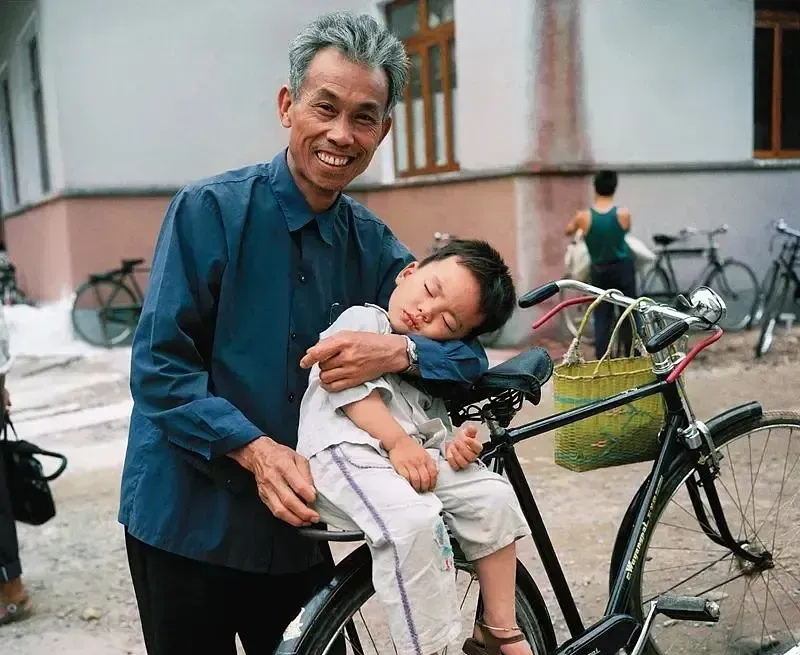 图里孩子窝在车梁和车座之间,手臂绕着大人的胳膊,睡得歪歪斜斜,爷爷笑得见牙不见眼,前筐里还夹着竹篮,回去准有西红柿鸡蛋面等着,风把裤腿吹成旗子,打盹也香。