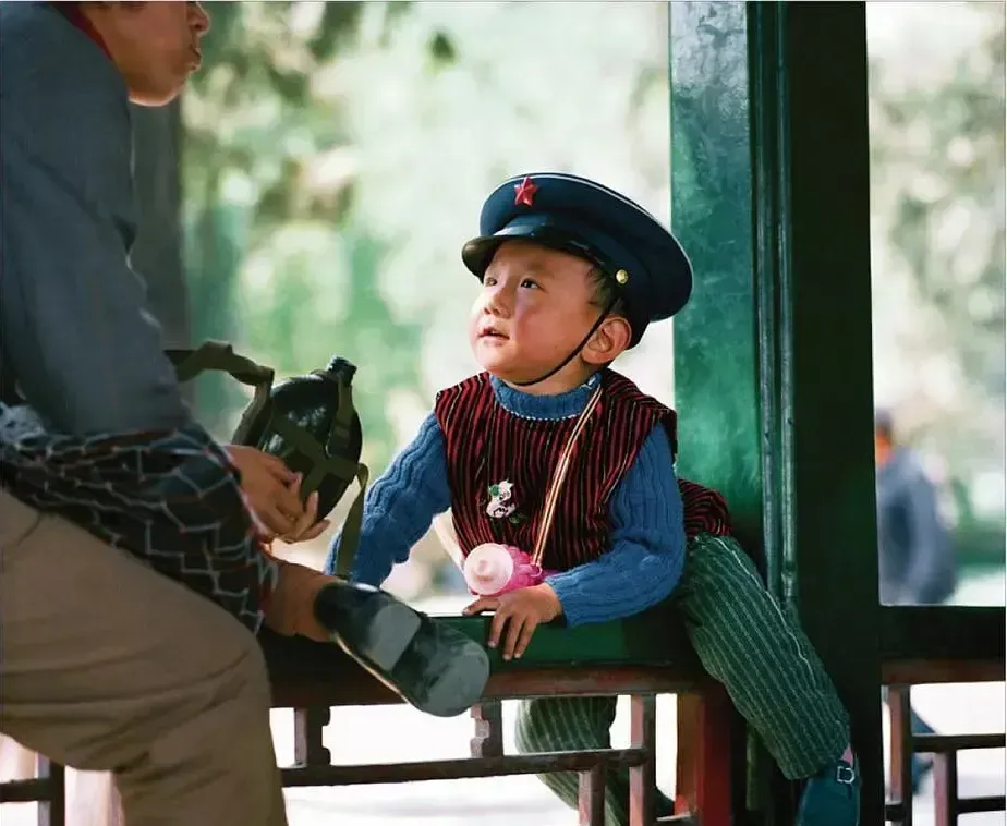 这个小帽叫解放帽,前面一颗红星亮堂堂,脖子上挂着塑料口哨和小水壶,坐在凉亭栏杆上晃腿,家里人把搪瓷壶递过来,嘟囔一句别撒了烫嘴,孩子仰头咕咚咕咚,一抹嘴角继续爬栏杆。