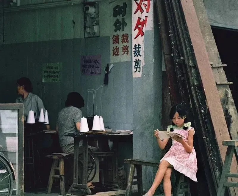 这个场景是裁缝铺,对外裁剪几个大字钉在墙上,门里脚踩缝纫机哒哒响,门口女孩捧着小人书,阳光斜着照到书页上,以前衣服大了小了都修,哪像现在动不动就换新的。