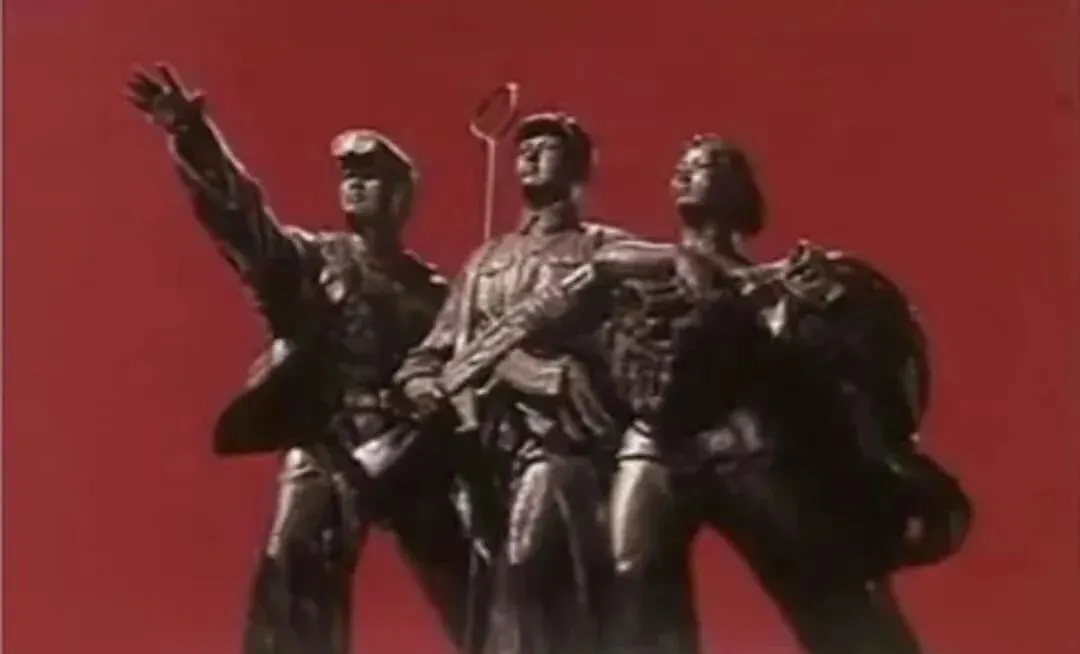 图中这组三人群像叫片头雕塑,青铜色的质感在红幕前特别硬朗,左手指向远方的姿势,一下就把“向前看”的劲头立住了,小时候电视里一出现它,我妈就嘀咕,安静安静,电影要开始了。