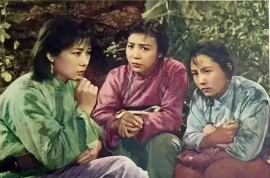 图中三个姑娘叫地下交通员,青绿粉三色衣裳蹲在山坳里,袖口和衣襟磨得发亮,手背紧攥在一起,眼神偷偷商量,戏里刀口舔血,戏外呢,我奶奶笑,说那时候看完回家就照着梳辫子,学人家把发卡往后别。