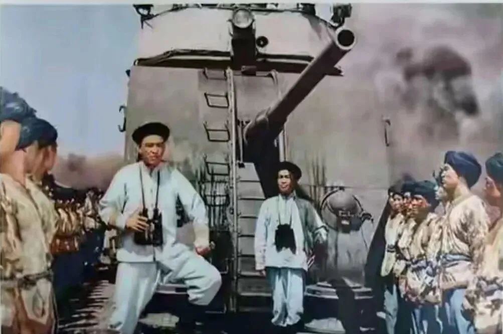 这个场面叫铁甲舰桥,舷侧炮口黑洞洞地对着人群,甲板上两位穿长衫的壮丁昂着头,胸前挂望远镜,台词不多,气势先到,爸爸感叹,电影就是要让人一眼看明白,谁强谁弱,不用长篇解释。