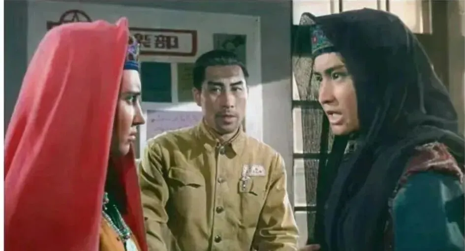 这张照片里,红头巾黑披巾对峙的姑娘叫金花和古兰丹姆,边上穿军装的干部把手一摊,像在劝架,窗上糊着的宣传画只露半个角儿,时代味道一下就出来了。