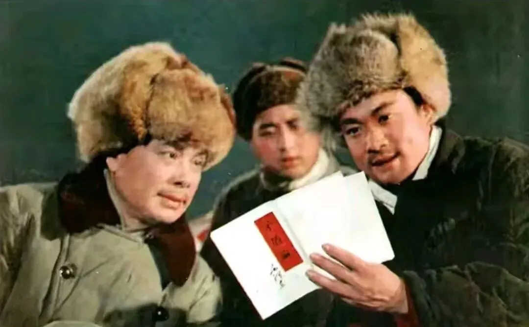 这张里边拿着文件的人叫技术员,厚羊皮帽子把额头压下一道印,手里那本小红封面写着方案,屋里白汽哈着气,大家围着一盏煤油灯,翻页的“沙沙”声,小时候在放映队的小屋里我真听过。