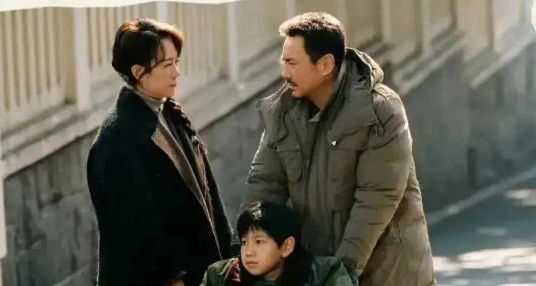 这个三口之家站在冬天的路边,呢子大衣和军绿色棉服一搭,小孩缩在推车里,爸爸的手搭在把手上,像在说,再走两步就到家了,这种日常戏,现在看也不“旧”,只觉得暖和。