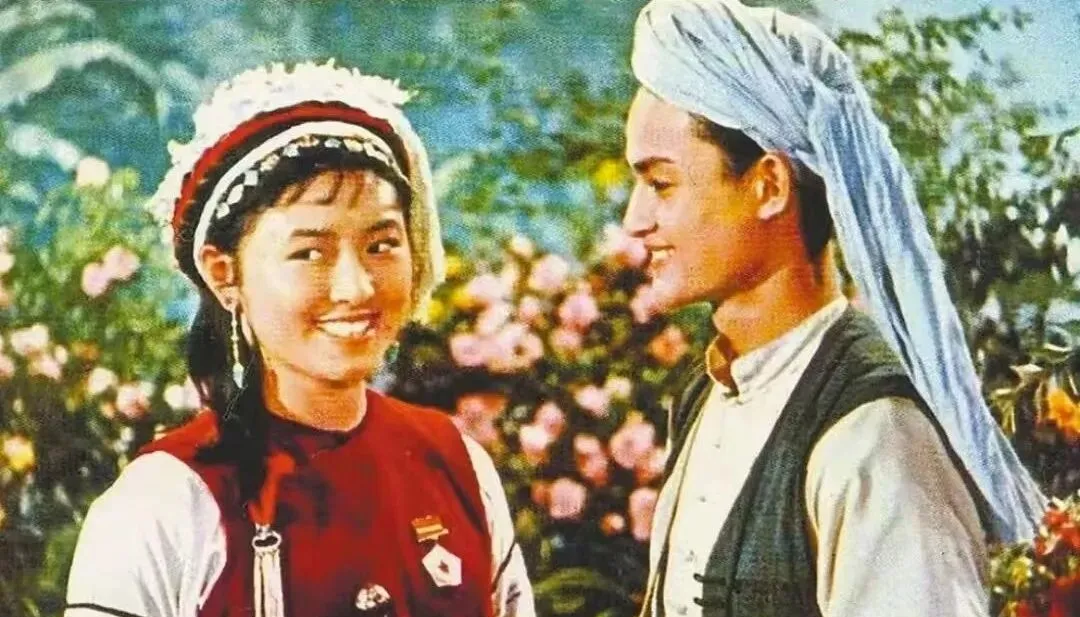 图中这对小青年,一人斜披白帕,一人头戴花环,背景里花团锦簇,嘴角抿着歌儿,婶婶说,那会儿电影里一唱,院子里就跟着哼,山歌一搭,就把日子唱甜了。