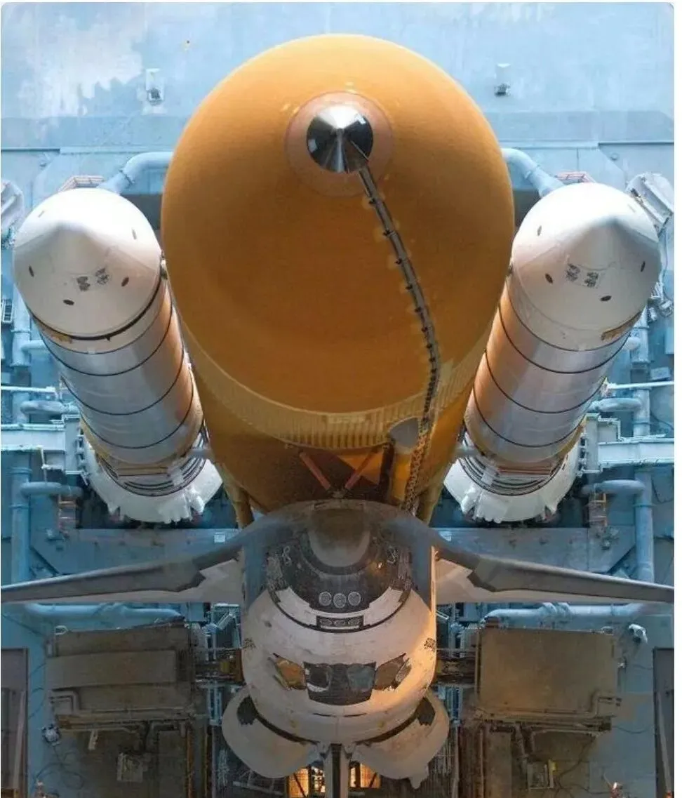 这个角度下的航天飞机,外接燃料箱像一节巨大的橘黄色葫芦,两侧固体助推像白色长矛,机头下吊着工作平台,灯光把机腹照得暖暖的,爸爸看了嘀咕一句,这玩意儿离地那一刻,地面的人心都要悬起来了。
