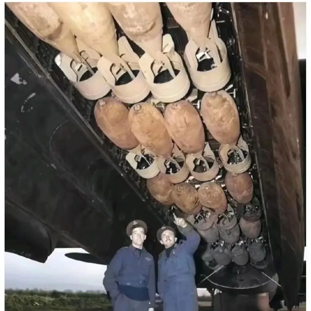 这张是老式轰炸机的弹舱,一排排炸弹像铁葫芦挂在滑轨上,地勤穿着厚呢制服,仰头比划着检查卡扣,那种时代的粗粝感一下扑过来,以前只在电影里听轰鸣,现在看到细节,反而更怕它落下的那一下。