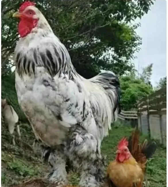 这只毛绒绒的大个子叫婆罗门鸡,雪白底子,颈羽一撮黑,站在普通土鸡旁边像俩物种,我第一次见以为是P的,后来朋友说真有,成年的能顶到孩子的肩,想起小时候追鸡满院子跑,这家伙要是朝我扑过来,我准得先认输。