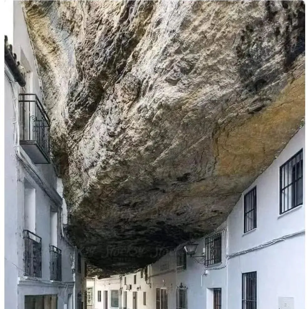 这个巨大的“天花板”其实是岩石,房子直接卡在悬岩底下,白墙黑窗,阳台探出去就能摸到石面,奶奶看见这张说一句,住这儿的人做梦都不敢翻身吧,想想也真是,过去讲避风避雨,现在人家直接把山借回了家里。