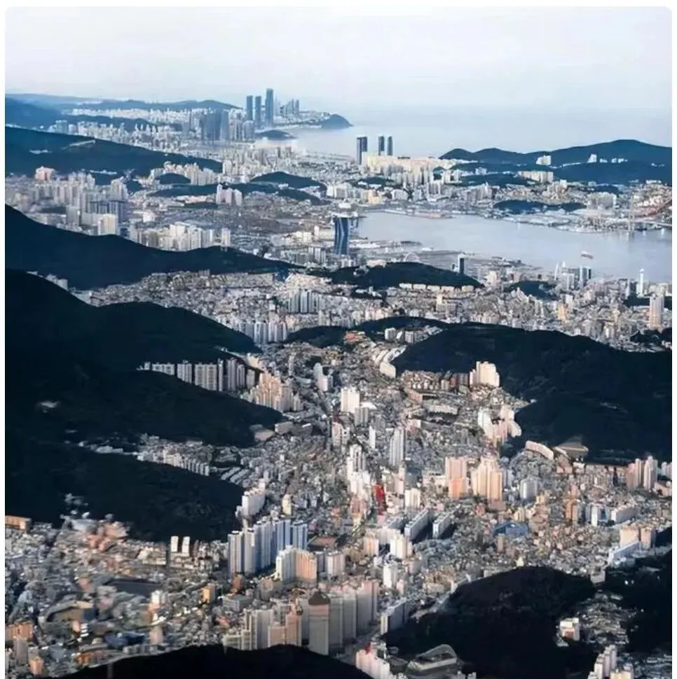 这一片层层叠叠的是海滨城市,湾里银光一带,楼像海浪堆起来,街道顺着山势扭过去,小时候我以为海边只有沙滩和海鸥,现在看见这样的城市肌理,才知道人也会像珊瑚一样,一点点在岸线生长出来。