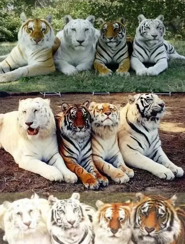 图里的老虎排成队坐好,白的、黄的、还有深橙的,毛色不一样,神情却一样懒洋洋,小时候我们只会在连环画里分“东北虎”和“华南虎”,现在才知道,同一个物种里也能变出这么多色相,真是大自然的小心思。