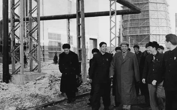 这个场景叫现场汇报,领导穿着呢子大衣走在前头,青年小伙跟在后面笑呵呵,边走边点头,图纸还没出全,产量先翻番的说法已经写进墙报了。