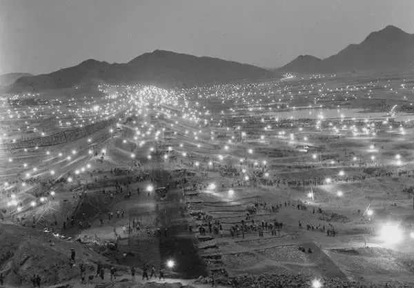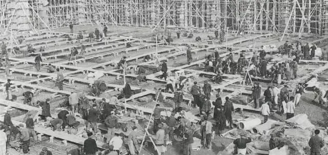 这叫大会战工棚,木桩支得密密匝匝,格子里分工明确,有人拌灰有人抬模板,锣一响全体转场,像摆钟一样准。