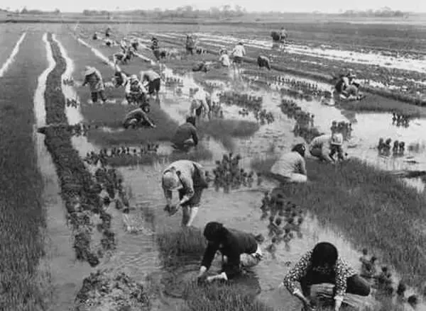 水田里的动作叫趟秧,脚下一陷一拔,泥浆凉到膝盖,手里的秧苗一撮撮按着行距下去,以前靠肩膀,现在机器一过就齐整了。
