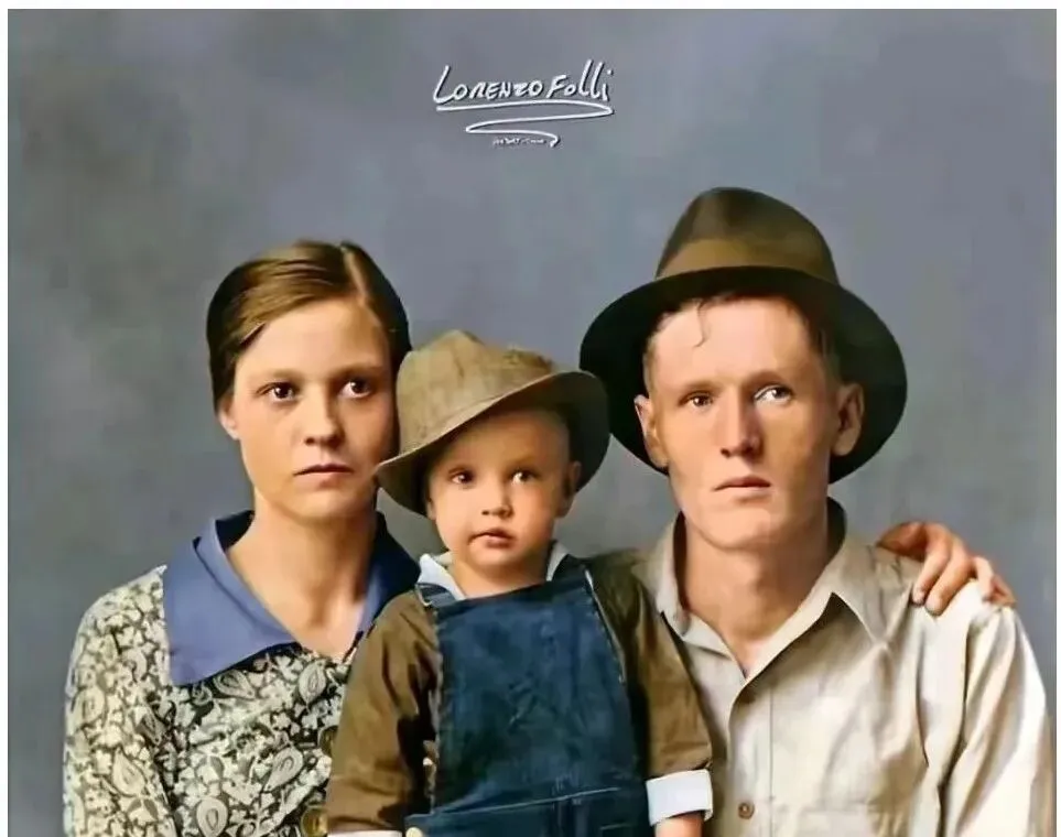 图中这家三口的合影叫家庭定影,朴素的呢绒帽子配背带裤,小孩站在中间像颗钉子把一家人钉在一起,妈妈的裙领是蓝的,爸爸的衬衣袖口卷着,表情都不笑却特别踏实,这种照片的底色就是日子本身,没滤镜也不修图,光从侧面打来,脸上一道亮一道暗,像给生活做了道刻痕。