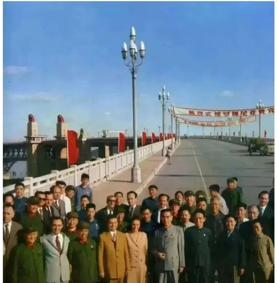 这个桥上的大场面叫参观留影,横幅在风里拱起来,路灯一溜排开,队伍站成密密一片,老照片里的人喜欢端正地看镜头,脚下是新修的水泥路,身后轧轧驶过的大车还冒着白气,那时候拍一张不容易,人人都把最体面的衣服穿上,站稳了才按快门。