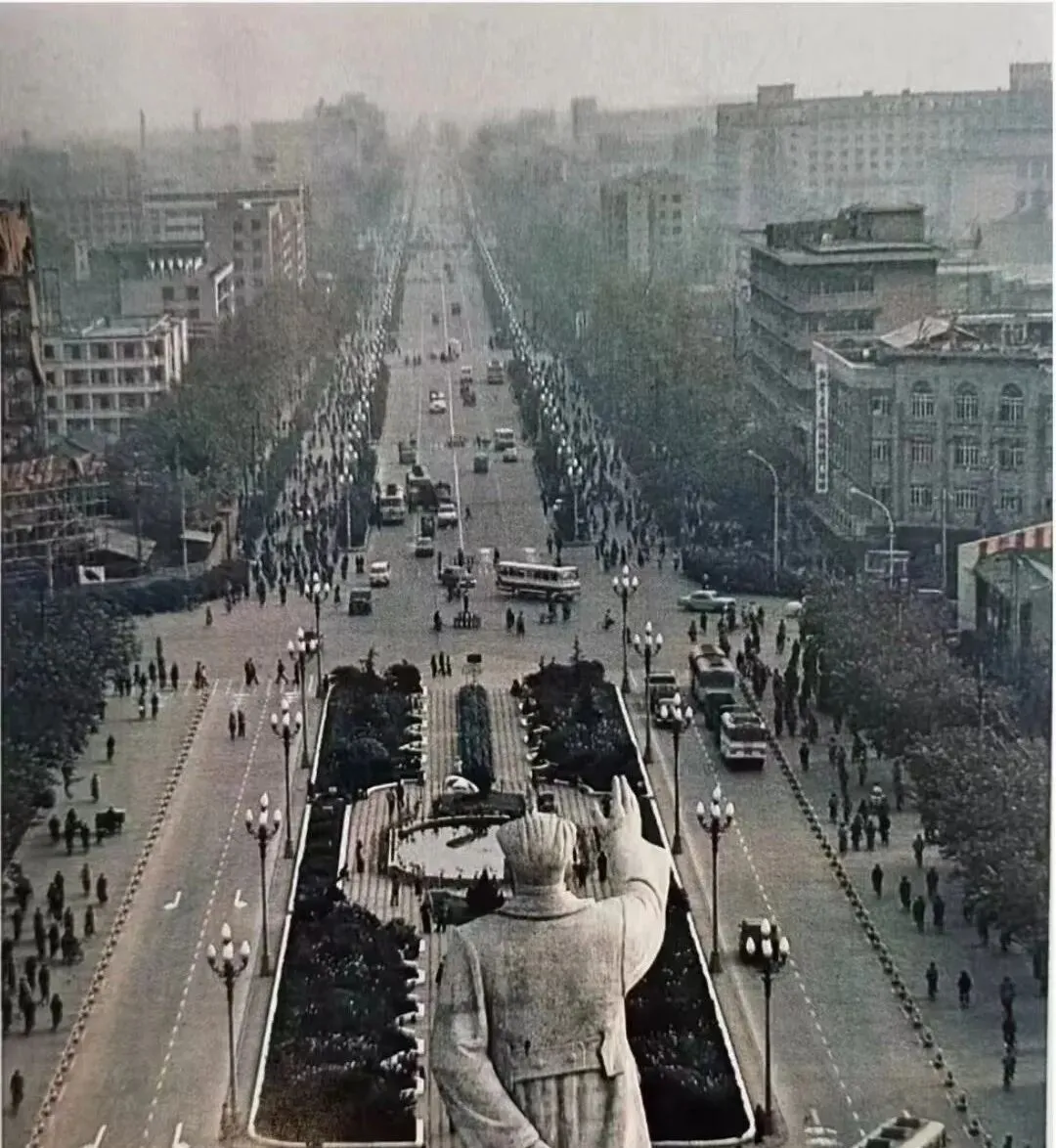 这张从高处俯拍下去的叫城市脊梁照,大道像拉直的细线穿过去,两侧树影密密,车不多人却不少,前景里一尊高大的身影举手向前,像把整条路往前拨了一把,奶奶说以前来这儿逛过年街,棉帽子被风吹歪了也舍不得按,怕压坏发卡呢,现在高楼林立灯火通明,热闹是翻倍的,脚步也是翻倍的快。