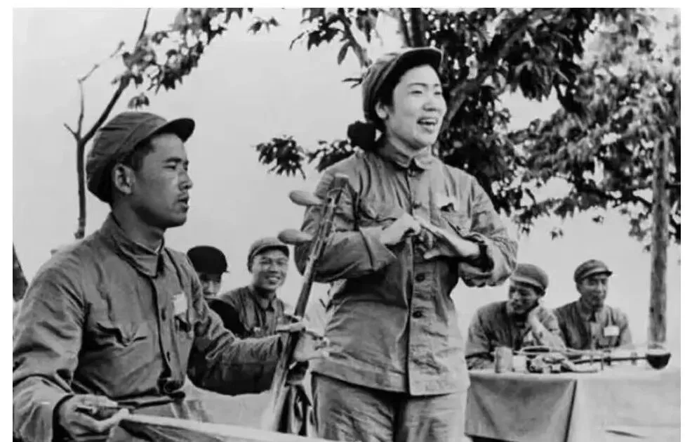 这一张在树下唱段子的叫野台慰问,三弦一挑一挑的,节拍在手心里打着,唱的人笑着,台下的人眯着眼听,裤腿卷到小腿肚,泥点子干在鞋面上,妈妈说那会儿最盼部队来演出,哪怕汗水顺着脖颈往下淌,也要挤在前排不眨眼。