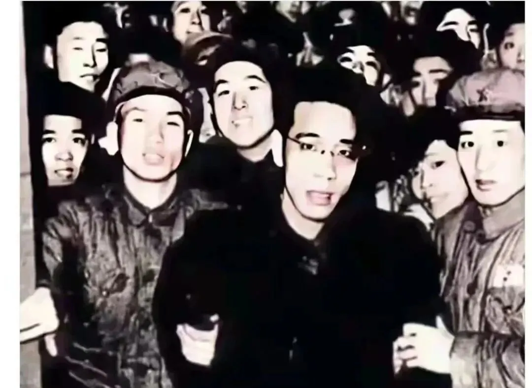 这张人群里挤挤挨挨的叫街口合影,脸被闪光一冲变得亮白,眼镜片反着光,几只手搭在同伴肩上,嘴巴张得像在喊什么,背景黑得像一堵墙,热闹全堆在脸上,像从一个冬夜的门缝里一下子涌出热气。
