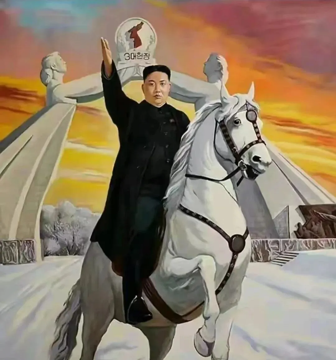 最后这一幅骑白马的叫画中宣像,晚霞把天烫成橙红,白马抬蹄,缰绳扣得紧紧的,人物抬手向前,背后拱门像两只手把天撑开,画比照片更要紧的是气势,线条都往前冲,雪地一层层压住冷意,远处的树却像在冒烟,视觉里的热和冷撞在一起,就把情绪点起来了。
