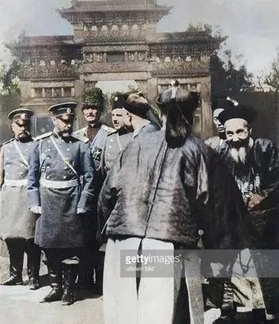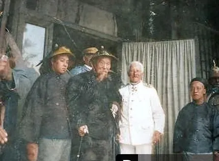 这个画面叫异样同框的礼节场,制服一侧扣成排,勋章一坨坨在阳光下发亮,另一边则是长袍马褂的雍容,帽頂小小一抹朱红稳在头上,手里或拄拐或拢袖,站在门口的木槛前,脚背自然并拢不抢镜,镜头收住时,翻译往往挤在两人之间半步的位置,奶奶说,拍这种合照,先看谁在中间,其次看谁把手摆得从容,这些都是无声的说明书。