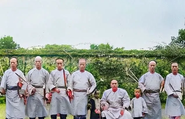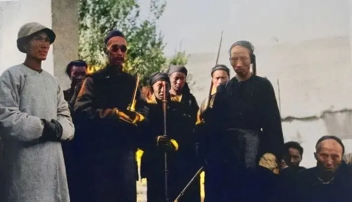 图中这队人拿着长枪的叫家丁,前头戴瓜皮帽的那位一手攥着水烟袋,一副黑圆镜遮着半张脸,身量虽瘦,站姿却挺得很,家丁排成一溜,枪口朝下不乱晃,走在路边时会分散开,拐弯的当口儿还得先探路,奶奶说那年头路上不太平,土匪躲在沟坎里,护送出门可不是摆样子,是真家伙真防身,现在咱上路开导航,手机一亮哪都找得到,人也轻松了,想想以前出趟门得张罗半天。