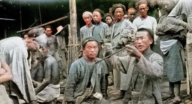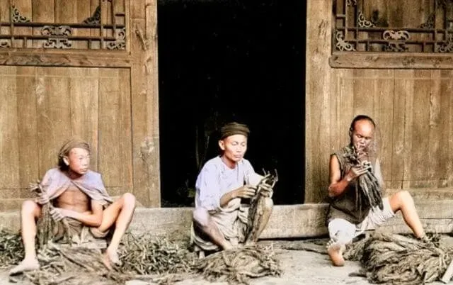 清末老照片:地主出行家丁沿途警戒护送,挑柴老汉,清军弓箭手,搓麻绳的妇女,盐贩子称盐。
