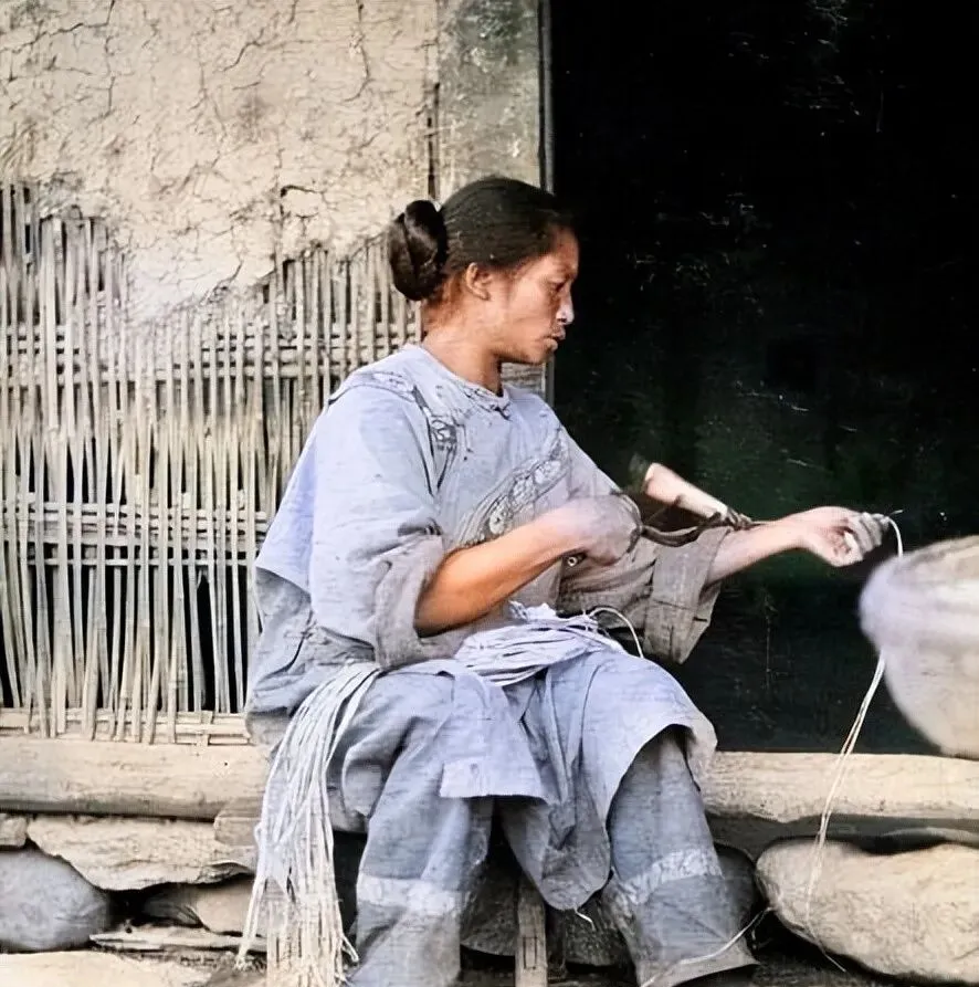 这个活儿叫搓麻,女人把麻纤维拽在膝上,右手捻,左手接,纤维像水丝一样拧成股,衣襟上补了几块布,袖口磨得起毛,坐的小板凳腿都斜了,外婆看见这张图会叮嘱一句,绳头先蘸水再续,接茬儿才伏帖,别看只是一根麻绳,绑鸡笼、扎柴束、修耙齿,家里处处要用得上,那时候手里的一根线能拉出半个家当,现在打包有塑料扎带,轻巧又省事,就是手心里少了那股麻的温度。
