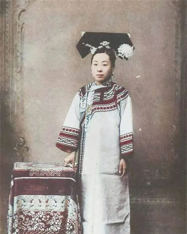 图中这身宫装叫大礼服,头上那块横着的叫旗头,黑亮的硬托外面簪着白绢花,衣襟边滚着红黑相间的云纹,袖口是宽宽的马蹄袖,站姿板正,眼神淡定,整个人就像被规矩托住了似的,奶奶看见这张就嘟囔,别看衣裳体面,穿着可不轻快,走起路来一步三小停,怕把绣线蹭毛了。