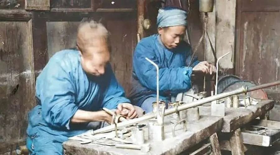 这个场景是做水烟壶的作坊,长条木案子上摆着铜节、烟碗、细长的烟杆,师傅袖口卷到胳膊肘,手里攥着锉刀和小锤,铜片一块块敲到服帖,旁边砂轮咝咝响,火星子一蹦一跳,外公说,好的水烟壶嘴子要细,抽起来不燥嗓子,讲究的人还往水里滴两滴薄荷油,现在抽烟一撕小盒子就点着了,那套讲究早稀薄了。