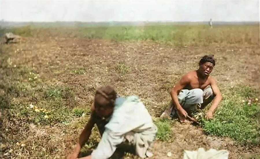 这张里的人在挖野菜,弯腰贴着地皮,指尖一撮就把马齿苋从泥里拎起来,太阳辣得要命,背上闪着汗光,以前春荒一到,家家都出去寻,回家一锅清汤下去,撒把盐就够一家人对付一顿,妈妈说现在菜市场一排排绿油油,随手拎袋回去就行了,那时候的菜呀,得走一路才攒够一筐。