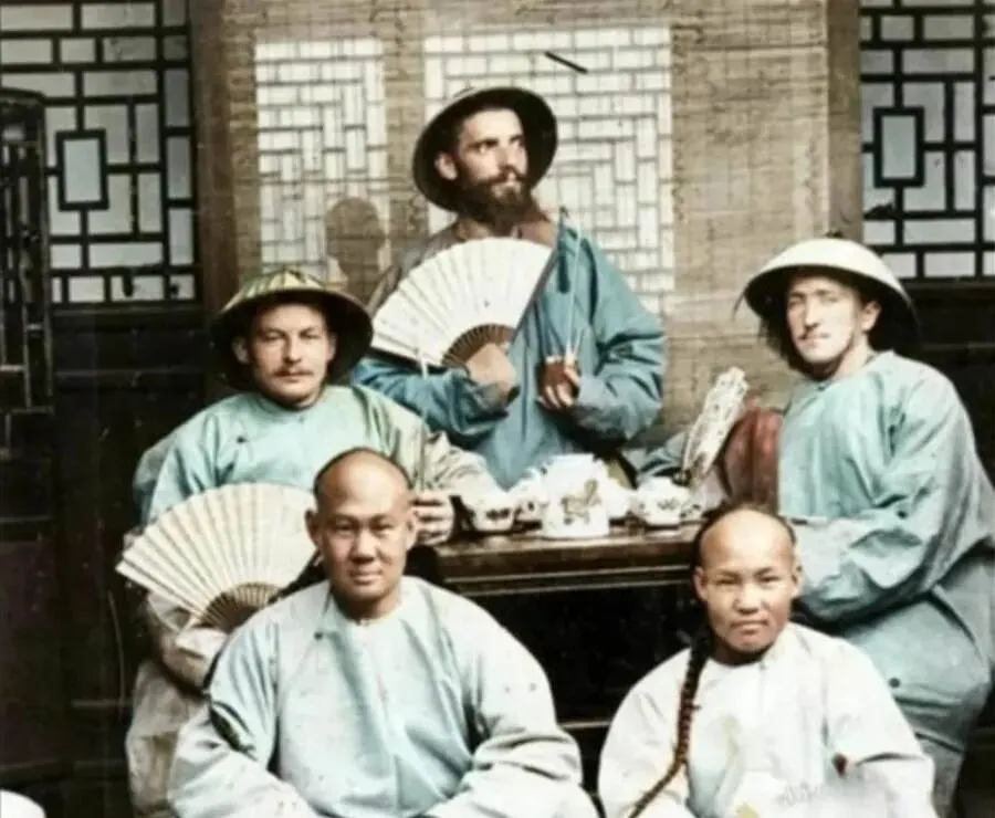 这张里坐着几位穿长衫的洋人,手里还摇着折扇,桌上摆满盖碗和点心盘,这个场景叫茶局,后头是格子窗和竹帘子,几样器皿看着就讲究,壶嘴细长,杯沿薄得能透光,旁边两个中国东家坐得稳稳当当,表情很客气,外婆说那会儿做买卖就是这样,你来我往先喝口茶,把客气落稳了再谈事,现在邮件一封视频一开,三言两语就把事定了。